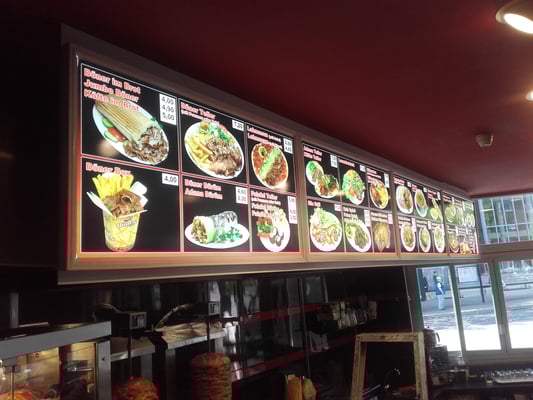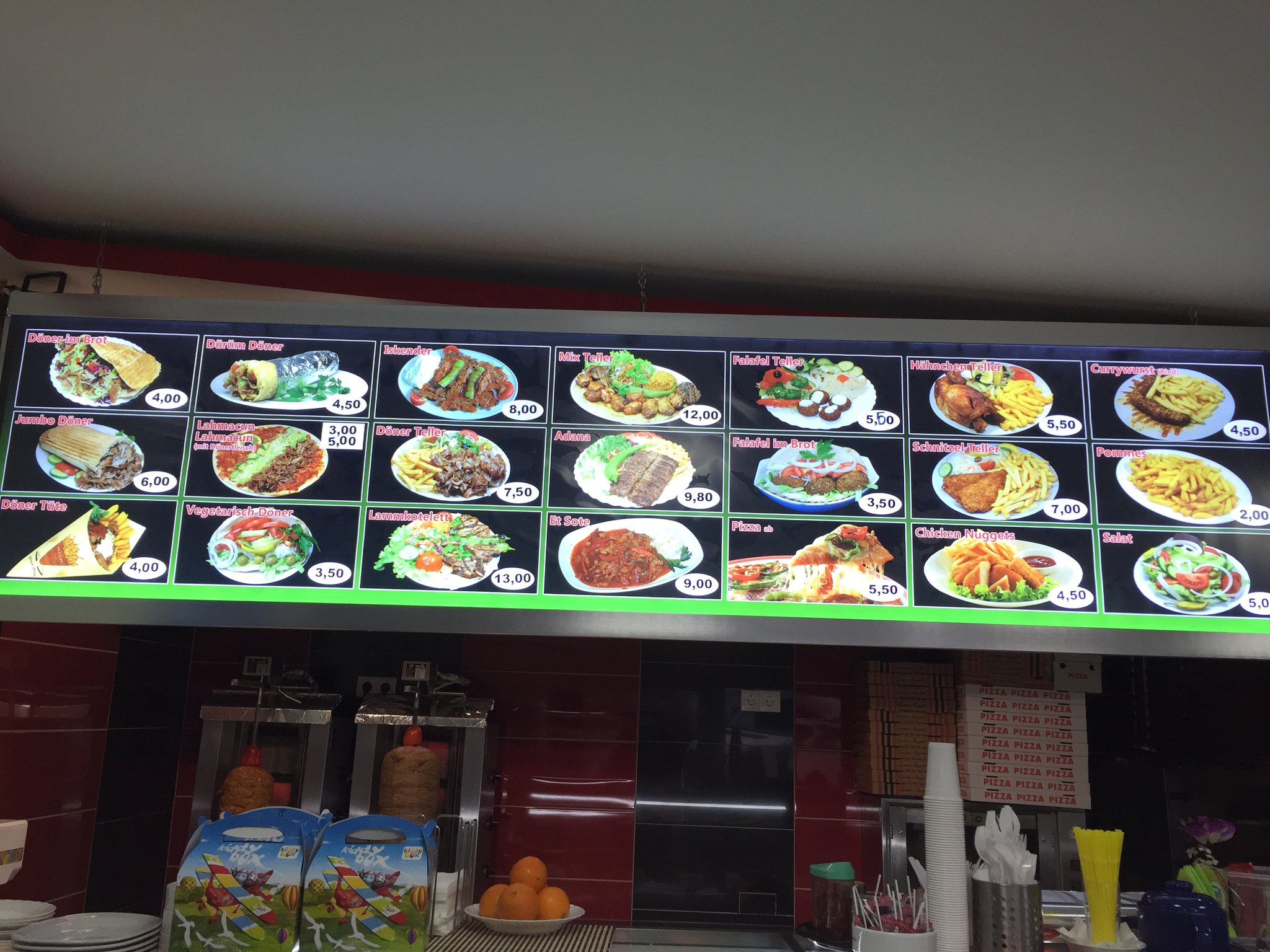 Ob z. B. Döner im Brot, Döner Dürüm, Fleischspieße, Beilagen wie Pommes oder Reis, diverse Suppen oder verschiedene Salate oder Tzaziki. Mit einem beleuchteten Menü-Board setzen Sie Ihr Angebot ins richtige Licht. Menüboards bringen gut und gleichmäßig ausgeleuchtet Bilder von Speisen und Getränken. Da isst das Auge schon vor der Bestellung mit.