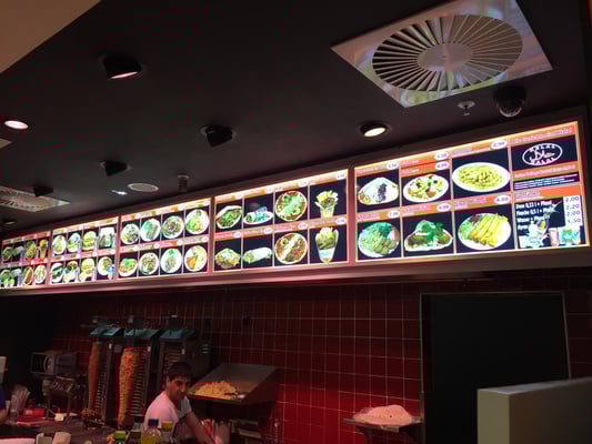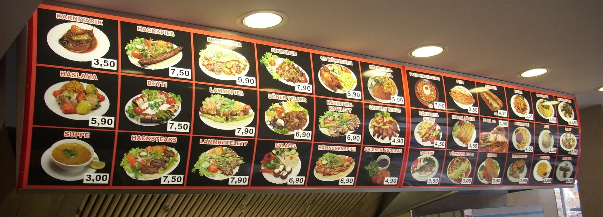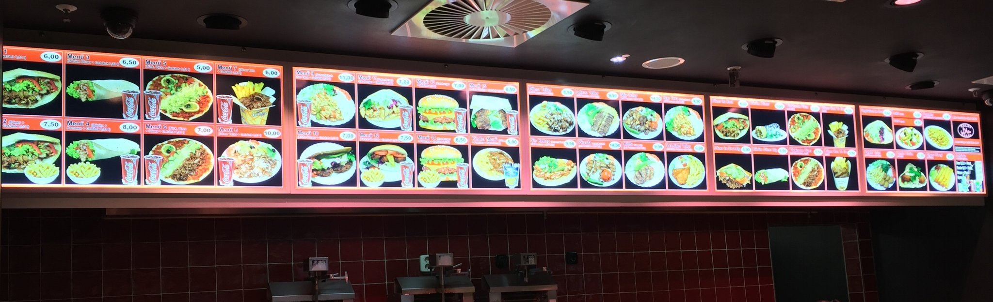 Menü-Boards mit gut ausgeleuchteten Bildern der bestellbaren Speisen sollten in keinem Schnellrestaurant oder Imbiss fehlen.